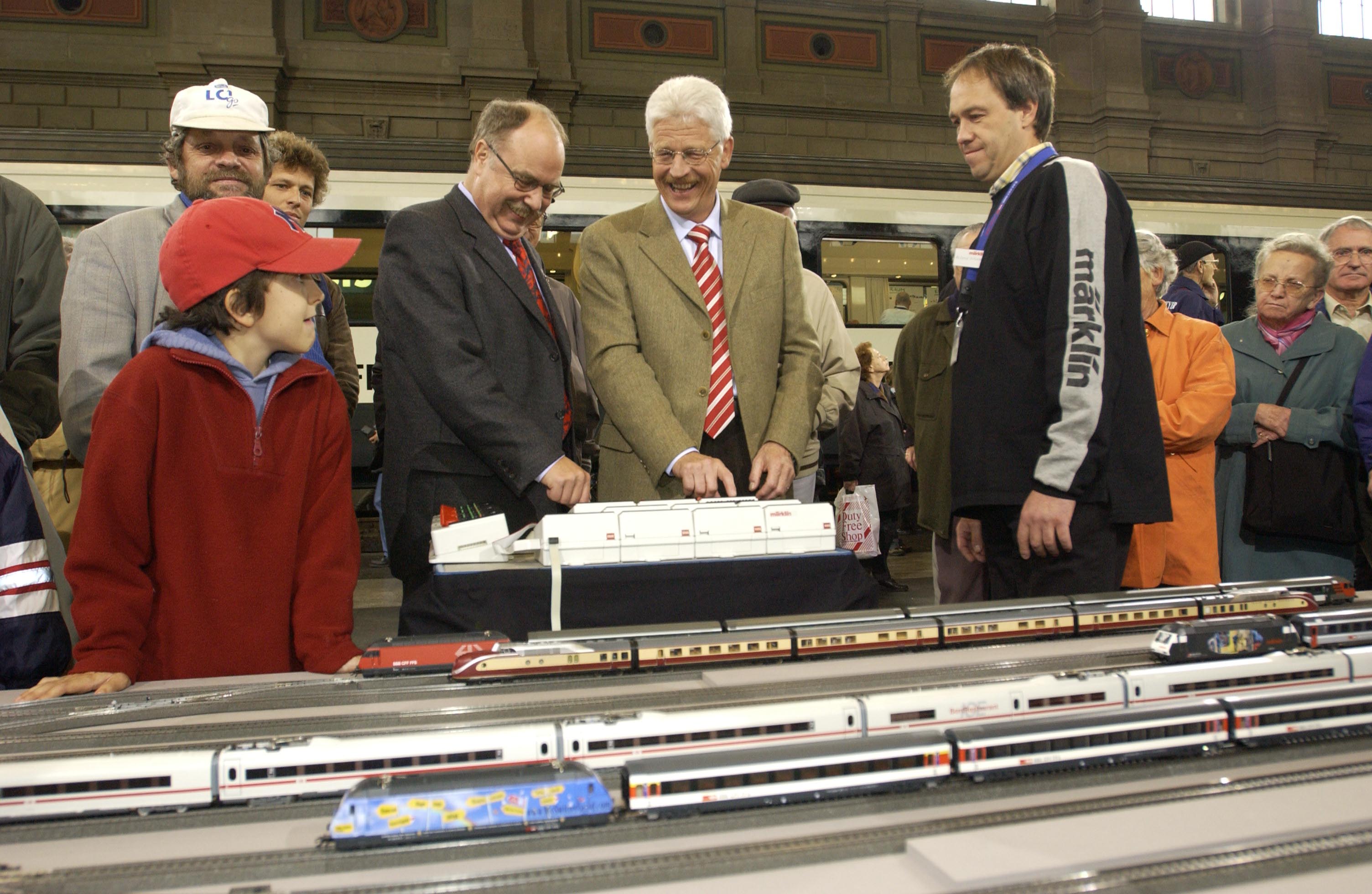 Ständerat Ernst Leuenberger und Benedikt Weibel, CEO der SBB, beim gemeinsamen Weichenstellen.