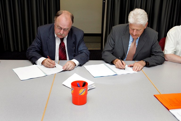 Vertragspartner bei der Unterzeichnung des SBB GAV 05: Benedikt Weibel (rechts) und Ernst Leuenberger