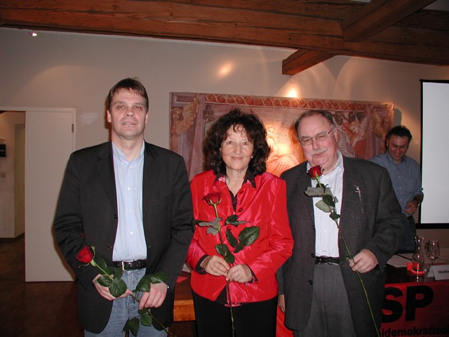 Eine Rose für die Referierenden am SP-Parteitag in Dornach am 22. Februar 2007 v.l.n.r. Kantonsrat Markus Schneider, NR Bea Heim, Ernst Leuenberger Foto: z.V.g)